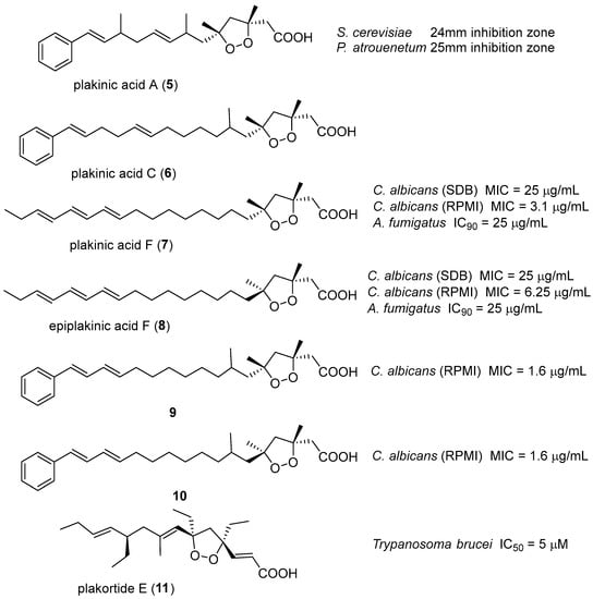 A number of cyclic peroxides, many of which exhibit antibacterial, antifungal and anti-cancer activity, were isolated from the marine organisms, in particular from the sponges Plakinidae [55]. Plakinic acid А (5) effectively inhibits the growth of fungi Saccharomyces cerevisiae and Penicillium atrounenetum [56]; plakinic acid F (7) and epi-plakinic acid F (8) exhibit moderate antifungal activity against Candida albicans and Aspergillus fumigatus [57]; 1,2-dioxolane acids 9 and 10 inhibit the growth of Candida albicans [58]; and plakortide Е (11) show good activity against Trypanosoma brucei (Scheme 1) [59].