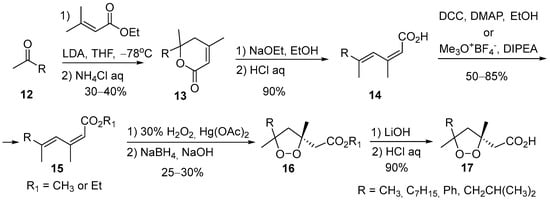 The first synthesis of diastereomeric saturated analogs of plakinic acids A, C and D 17 was reported in 1996 by Bloodworth and colleagues [60]. Peroxides 17 were prepared in four steps from ketones 12. In the first step, ketone 12 was condensed with ethyl 3-methylbut-2-enoate with formation cyclic lactones 13 hydrolysis, which led to acids 14. Peroxymercuration of esters 15 followed by reduction with sodium borohydride afforded 1,2-dioxolanes 16 saponification, which resulted in 1,2-dioxolanes 17 with carboxylic group (Scheme 2).