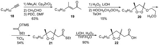 The synthesis of diastereomeric 1,2-dioxolanes 22 from alkynes was described [61]. Carboalumination of alkyne 18, followed by treatment of the intermediate alkenylaluminum with acetaldehyde, resulted in an allylic alcohol that was oxidized to enone 19. Conjugate addition of H2O2 to 19 in the presence of LiOH followed by acid-catalyzed esterification of diastereomeric dioxinole by 2-methoxyethanol provided alkoxydioxolane 20. Substitution of the methoxyethoxy group in 20 by the action of silyl keteneacetal ethyl thioacetal in the presence of TiCl4 led to thioether 21 as a 1:1 mixture of two diastereomers. The hardly-separable cis- and trans-diastereomeric peroxides 22 were obtained as a result of hydrolysis with high yield (Scheme 3).