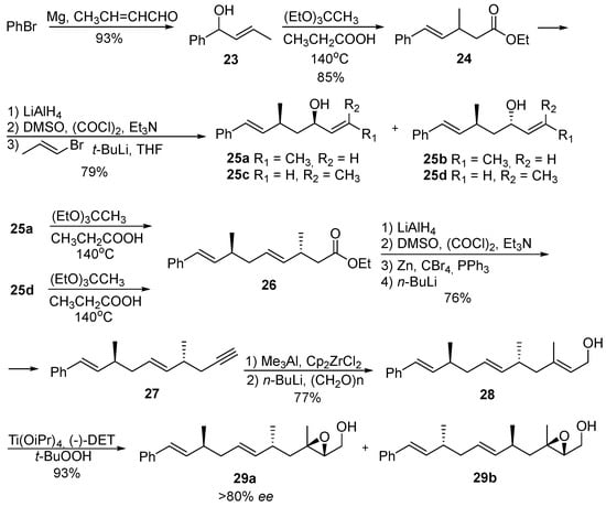 In 2006, the first asymmetric synthesis of plakinic acids was reported [62]. The key step of side chain construction was synthesis of diastereomeric allylic alcohols 25 from bromobenzene. This transformation included subsequent addition Mg-organic compound to crotonaldehyde with formation of alcohol 23, Claisen homologation resulted in ester 24, and reaction of an intermediate aldehyde with propenyl lithium (Scheme 4).