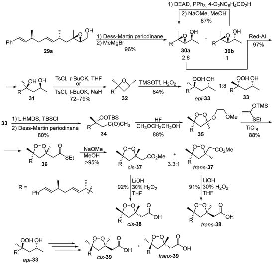 As a result of following transformation epoxy alcohol 29a was prepared, which was oxidized into aldehyde; subsequent addition of methylmagnesium bromide resulted in isomeric secondary epoxy alcohols 30а and 30b (Scheme 5). After transformation of minor 30b into 30a, the latter was reduced to diol 31. The treatment of diol 31 with stoichiometric quantity of TsCl and excess of t-BuOK led to oxetane 32. The ring opening with TMSOTf provided easily separable 3-hydroxy hydroperoxides 33 and epi-33; 33 was converted into peroxy ketone 34 by subsequent silylation and oxidation. The ketone 34 was transformed into alkoxydioxolane 35, and after that into thioester 36. The desirable plakinic acids 38 were prepared by hydrolysis of methyl esters 37. A similar strategy was used for the synthesis of stereomeric acids 39 from 3-hydroxy hydroperoxide epi-33.