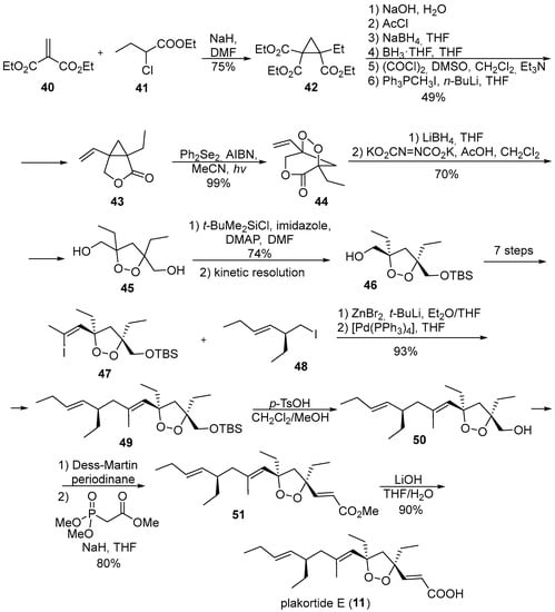 A total synthesis of plakortide E (11) based on radical oxygenation of vinylcyclopropanes was reported [63,64]. The key intermediate 2-ethyl-1,1,2-cyclopropanetricarboxylate (42) prepared from methylene malonate (40) and α-chloro ester 41 was transformed into lactone 43. The treatment of the latter with oxygen, Ph2Se2 and AIBN furnished spiro 1,2-dioxolane 44, followed by lactone ring opening of 44 to form diol 45. The precursor of the plakortide E 49 was synthesized from the iodo-derivative of 1,2-dioxolane 47 and the halogen derivative 48 by Negishi reaction. Desilylation of alcohol 49, subsequent oxidation and Horner–Wadsworth–Emmons olefination provided ester 51 which was hydrolyzed with formation of plakortide E (11) (Scheme 6) [63].