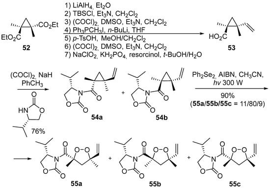 A similar strategy based on the radical oxygenation of vinyl cyclopropanes was used for the synthesis of epiplakinic acid F (8) [65]. The vinyl cyclopropane 53 obtained from trans-1,2-cyclopropanedicarboxylate 52, was then converted to 1,2-dioxolane 55 (Scheme 7). After separation of the diastereomeric mixture isomer 55b was used for further transformations.
