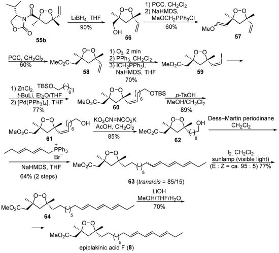 Enantiomerically pure 55b was reduced by LiBH4 to alcohol 56, which was transformed to vinylether 57 by subsequent PCC oxidation and Wittig olefination. Oxidation of 57 to methyl ester 58, reductive ozonolysis of 58, and Wittig olefination gave predominantly the Z-isomer of vinyl iodide 59. The Negishi coupling of 59 with the halogen derivative led to the desired product 60. Desilylation of 60 followed by reduction of 61 resulted in saturated alcohol 62. The oxidation of 62 led to an aldehyde, the Wittig olefination of which provided the precursor 63 as a mixture of isomers. The product of photoinduced isomerization of this mixture was the trans-isomer 64. The target epiplakinic acid F (8) was obtained by alkaline hydrolysis of ester 64 (Scheme 8).