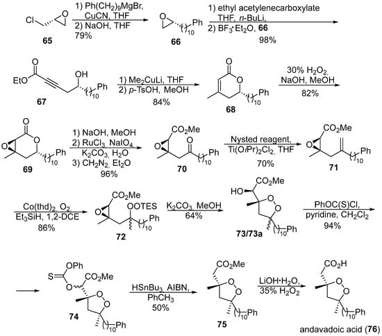 The method of the preparation of andavadoic acid (76), a natural compound isolated from the sponges of Plaxortis aff simplex, based on the Isayama−Mukaiyama reaction and subsequent cyclization was known [66]. The starting substrate was epichlorohydrin (65), which was converted to epoxide 66 by a subsequent the organomagnesium compound addition and cyclization with the help of alkaline. The regioselective opening of the epoxide cycle of 66 by the lithium salt of ethyl propiolate in the presence of BF3 resulted in the secondary alcohol 67 in almost quantitative yield. Alcohol 67 was converted into lactone 68 by reaction with Me2CuLi, followed by acidification. Oxidation of lactone 68 to 69, subsequent ring opening, oxidation of hydroxyl to the carbonyl group, and methylation resulted in epoxy ketone 70, which was then converted to epoxy alkene 71. Isayama–Mukaiyama peroxidation, the base-catalyzed cyclization of peroxide 72, leading to a mixture of diastereomeric 1,2-dioxolanes 73/73a followed by separation and thioacylation resulted in a peroxy thioester 74 which was converted into andavadoic acid (76) by subsequent reduction and hydrolysis of ester 75 (Scheme 9).