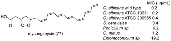 The symbiont of beetle of the southern pine (Dendroctonus frontalis), actinomycetous bacterium produces mycangimycin peroxide (77) with pronounced fungicidal activity (Scheme 10) [67]. Mycangimycin effectively inhibits growth of Candida albicans wild type, C. albicans ATCC10231, amphotericin-resistant strain C. albicans ATCC 200955, Saccharomyces cerevisiae and Ophiostoma minus [68].