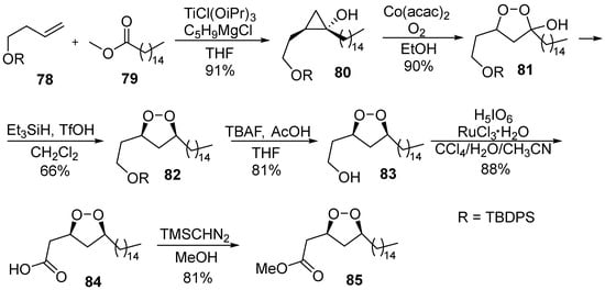 Two saturated analogs of mycangimycin were synthesized from alkene 78 and ester 79 (Scheme 11) [69]. The Kulinkovich reaction of 78 with 79 resulted in cyclopropane 80, which formed 1,2-dioxolane 81 by a cobalt-catalyzed cleavage in the presence of oxygen. TfOH-catalyzed reduction of the alcohol 81 by silane led to 3,5-disubstituted 1,2-dioxolane 82. The result of desilylation and oxidation of the obtained alcohol 83 is the first saturated analog of mycangimycin, acid 84, which can be converted into ester 85.