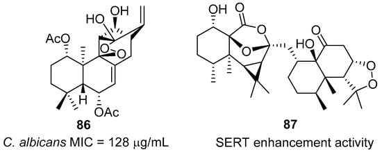 The diterpenoid peroxide 86, which has a weak fungicidal activity against C. albicans, was isolated from the liverwort Jungermannia atrobrunnea (Scheme 12) [70]. Dinardokanshone B (87), sesquiterpene peroxide, isolated from the roots and rhizomes of Nardostachys chinensis Batal. (Valerianaceae) showed significant enhancement effects on SERT activity (Scheme 12) [71].