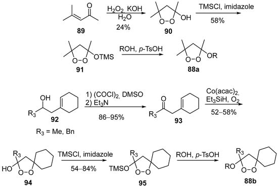 5,5-Dimethyl 1,2-dioxolanes 88a were prepared by peroxidation of mesityl oxide (89) in the basic medium, followed by alkylation of the free hydroxyl group of 3-hydroxy-1,2-dioxolanes 90 (Scheme 14) [73]. Synthesis of cyclohexyl derivatives 88b started from oxidation of alcohol 92 to an unsaturated ketone 93, followed by Isayama–Mukaiyama peroxidation with formation of 1,2-dioxolane 94. Further protection of hydroxyl group resulted in derivatives 88b (Scheme 14) [73].