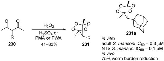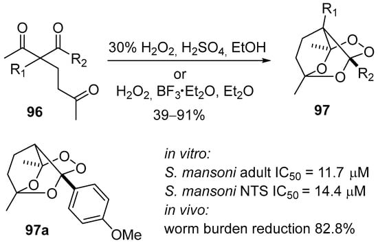 The series of tricyclic monoperoxides 97 with 1,2-dioxolane moiety showed a high anti-schistosomal activity. The maximum activity was observed for compound 97a, which revealed high worm burden reductions by 82.8% in S. mansoni mouse model (Scheme 15) [74]. Peroxides 97 can be obtained from β, δ-triketones 96 and hydrogen peroxide with use of either sulfuric acid [75], or boron trifluoride [76] as catalyst and co-solvent (Scheme 15).