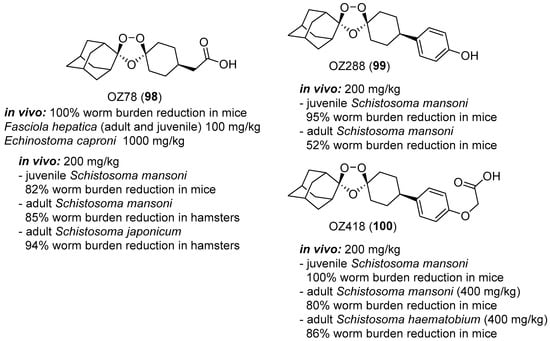 The ozonides OZ78 (98) and OZ288 (99) showed low toxicity and high efficiency against helminth cultures Schistosoma mansoni and S. japonicum harboured in mice and hamsters with a single oral dose of 200 mg/kg [82,83]. Antichistosomal activity of OZ78 (98) against S. japonicum was confirmed in experiments in mice and rabbits [84]. Later, the promising ozonide OZ418 (100) with high activity against both helminths of S. mansoni and S. haematobium was discovered [85].