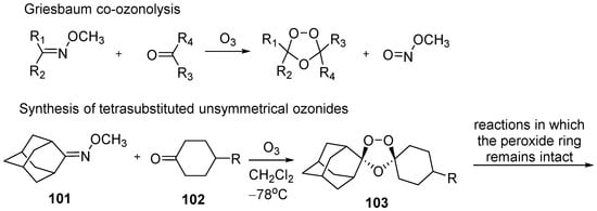Synthesis of tetrasubstituted unsymmetrical ozonides was discovered by Griesbaum and colleagues in 1995 (Scheme 17, top) [86,87]. Later this method was used for the diastereoselective synthesis of tetrasubstituted ozonides 103. Peroxides 103 were prepared by ozonolysis of 2-adamantanone O-methyl oxime (101) in the presence of substituted cyclohexanones 102 (Scheme 17, bottom) [88,89]. 1,2,4-Trioxolane ring in compounds 103 is resistant to the action of a wide range of reagents, which allows to proceed a variety of modifications of the cyclohexane substituent [88].
