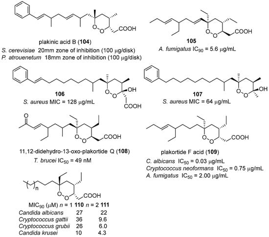 A number of compounds containing 1,2-dioxane fragment isolated from the Plakinidae sponges showed high fungicidal and anti-trypanosomal activity. Plakinic acid B (104) exhibited good fungicidal activity against Saccharomyces cerevisiae and Penicillium atrovenetum (Scheme 18) [56]. The acid 105 in vitro inhibits the growth of fungi Aspergillus fumigatus with IC90 = 5.6 µg/mL [58]. Compounds 106 and 107 were weakly active against Staphylococcus aureus [90]. 11,12-Didehydro-13-oxo-plakortide Q (108) was more active against Trypanosoma brucei [91]. Plakortide F acid (PFA) (109) showed high activity against Candida albicans, Cryptococcus neoformans and A. fumigatus [21]. Plakortides 110 and 111 also demonstrated high activity against a number of fungi [92]. Significant fungicidal activity of mixture of peroxyketal acids isolated from sea sponges was also reported [93].