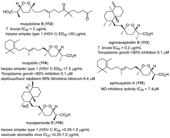 A series of peroxyterpenes was isolated from the sponges Diacarnus bismarckensis, the most active of which, (+)-muqubilone B (112) and sigmosceptrellin B (113) showed high activity against Trypanosoma brucei [94]. (+)-Muqubilone B (112) and muqubilin (114) (isolated from the sponges Prianos [95]) were in vitro effective against herpes virus (HSV-1), muqubilin (114) and (−)-sigmosceptrellin B (113) exhibited in vitro activity against Toxoplasma gondii (Scheme 19) [96]. Muqubilin (114) possesses herbicidal activity against tobacco Nicotiana tabacum [97], as well as epimuqubilin (115) showed NO inhibitory activity [98]. Mycaperoxide В (116) displays high antiviral activity against vesicular stomatitis virus and herpes simplex virus type-1 (HCV-1) [99].