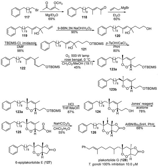 Several synthetic approaches to plakinic acids and their derivatives containing 1,2-dioxane ring were described. Natural 6-epiplakortolide E (127) was firstly synthesized from available 1-bromo-10-phenyldecane (117) in 10 steps by Diels–Alder reaction with singlet oxygen followed by iodolactonization (Scheme 20) [100]. In the first stage, the addition of the organomagnesium reagent to the unsaturated ketone resulted in enone 118, which was converted to a tertiary alcohol 119. Hydroboration of 119 led to diol 120, protection of hydroxyl group of which provide silyl ether 121. Diels–Alder reaction of diene 122 prepared by dehydration of 121 with singlet oxygen resulted in diastereomeric 1,2-dioxanes 123а and 123b. Deprotected diastereomer 124 was oxidized to acid 125, subsequent iodolactonization of this acid gave bicycle 126. Desirable 6-epiplakortolide E (127) was formed as result of radical reduction of iodine-containing bicycle 126. It was noted that related plakortolide G (128) is active against the protozoa Toxoplasma gondii [101].