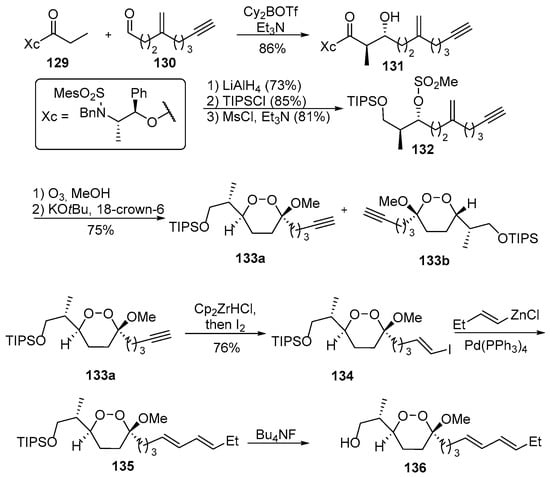 Asymmetric synthesis of alkoxy-1,2-dioxane 136 related to plakortolides was realized in 8 steps from carbonyl compounds 129 and 130 (Scheme 21) [102]. Enantioselective aldol reaction in first step resulted in aldol 131 which was converted into protected diol 132 in three steps. Diastereomeric 1,2-dioxanes 133a and 133b were formed by selective ozonolysis of double bond of 132. Hydrozirconation of 133а with following treatment by iodine led to the formation of vinyl iodide 134, followed cross-coupling of one resulted in 1,2-dioxane 135. Deprotection of 135 provided desirable peroxide 136.