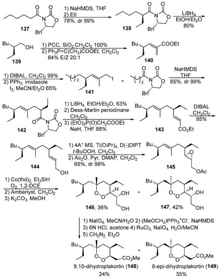 Natural endoperoxide 9,10-dihydroplakortin (148) and diastereomer 149 were synthesized through Evans’ chiral auxiliary chemistry (Scheme 22) [103]. Alkylation of oxazolidinone 137 and subsequent reduction of 138 led to alcohol 139, which was transformed into acrylic ester 140 (predominantly in E-configuration) by oxidation and Horner–Wadsworth–Emmons olefination. The ester 140 was reduced into corresponding alcohol, which was converted into iodide 141, alkylation of oxazolidinone by which resulted in derivative 142. The cleavage and olefination of 142 provided the ester 143. The reduction of 143 furnished alcohol 144 followed by Sharpless epoxidation and protection of primary hydroxy-group with formation of epoxide 145. Isayama–Mukaiyama peroxidation of epoxide 145 afforded mixture of diastereomeric 1,2-dioxanes 146 and 147 which were independently transformed into 9,10-dihydroplakortin (148) and 6-epi-dihydroplakortin (149).