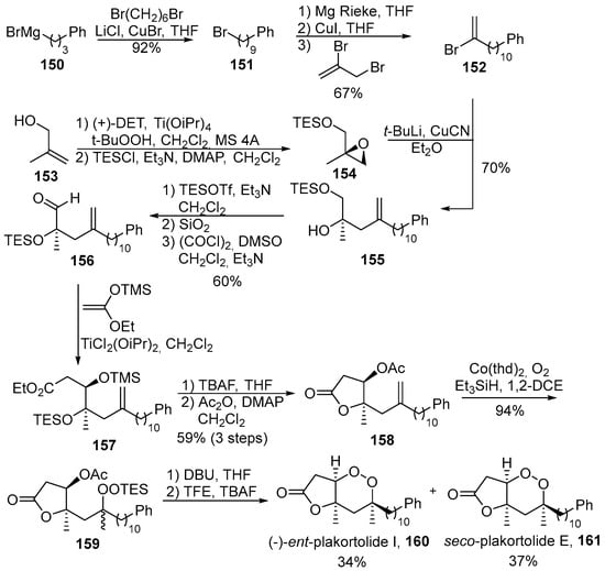 In the synthesis of diastereomeric plakortolides 160 and 161, the key steps are construction of protected diol 155 from protected 2-methyl glycidol 154 and vinyl bromide 152, diastereoselective Mukaiyama addition of aldehyde 156 with formation of ester 157 and hydroperoxidation of alkene 158 with subsequent cyclization of 159 (Scheme 23) [104].