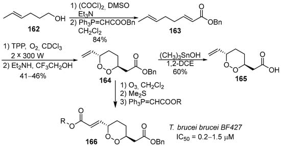 Synthesis of analogs of plakinic acids, 1,2-dioxanes 166 with a pronounced anti-trypanosomal activity was proposed from E-hexen-4-ol (162) (Scheme 24) [105]. Swern oxidation of alcohol 162 and subsequent Wittig-olefination led to ester 163. The reaction of unsaturated scaffold 163 with singlet oxygen and following cyclization provided 1,2-dioxane 164, which was hydrolyzed to acid 165. Derivatives 166 were prepared from ester 164 by consistent ozonolysis, reductive cleavage and Wittig reaction. Compounds 166 exhibited high activity against T. brucei brucei BF427.