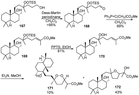 Diastereomeric cyclic peroxides 171, one of which is the methyl ester of the mycaperoxide B (116), were prepared from protected hydroxyperoxide 167 (Scheme 25) [106]. In the first step, peroxide 167 was oxidized to aldehyde 168, which was converted into unsaturated ester 169 by Wittig reaction. Hydroperoxide 170 synthesized by deprotection of 169 was cyclized into 1,2-dioxane 171 and oxolane 172 by the action of triethylamine.