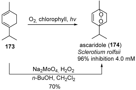 The first laboratory synthesis of ascaridole (174) was performed via photo-induced addition of singlet oxygen to terpene 173 by Schenck in 1944 (Scheme 26) [115]. Later, this reaction was realized in an industrial scale, because ascaridole was of great importance as an anthelmintic agent [116]. The method for the preparation of ascaridole using singlet oxygen generated in situ from sodium molybdate and hydrogen peroxide is known [117].