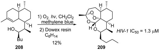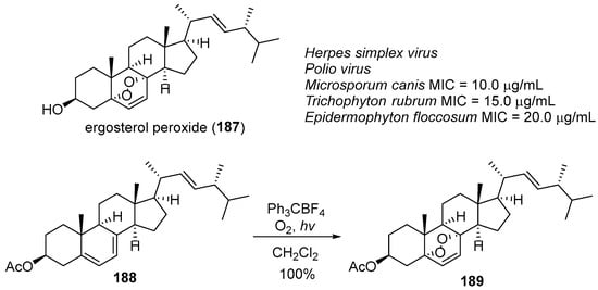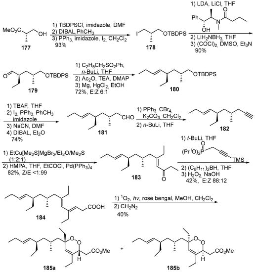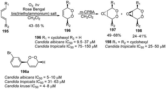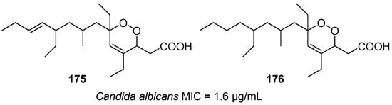 In 1990, Gunasekera with colleagues isolated 1,2-dioxenes 175 and 176 from sea sponge Plakortis angulospiculatus (Scheme 27) [120]. It was shown that these natural peroxides exhibit antifungal activity against Candida albicans (MIC = 1.6 µg/mL).