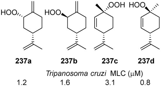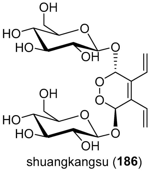 It was shown that ascaridole (174) at concentration 4 mM almost completely inhibits the growth of fungi Sclerotium rolfsii [118]. Presently, the side effects of ascaridole on the gastrointestinal tract have been described, and ascaridole is currently not used [119].