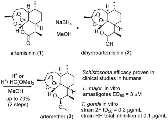 - Stringham, R.W.; Teager, D.S. Streamlined process for the conversion of artemisinin to artemether. Org. Process Res. Dev. 2012, 16, 764–768. [Google Scholar] [CrossRef]