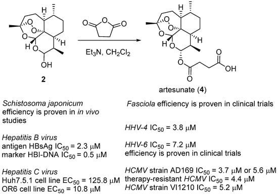 - Flobinus, A.; Taudon, N.; Desbordes, M.; Labrosse, B.; Simon, F.; Mazeron, M.-C.; Schnepf, N. Stability and antiviral activity against human cytomegalovirus of artemisinin derivatives. J. Antimicrob. Chemother. 2014, 69, 34–40. [Google Scholar] [CrossRef] [PubMed]