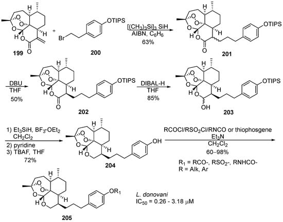 - Jung, M.; Bustos, D.A.; ElSohly, H.N.; McChesney, J.D. A concise and stereoselective synthesis of (+)-12-n-butyldeoxoartemisinin. Synlett 1990, 1990, 743–744. [Google Scholar] [CrossRef]