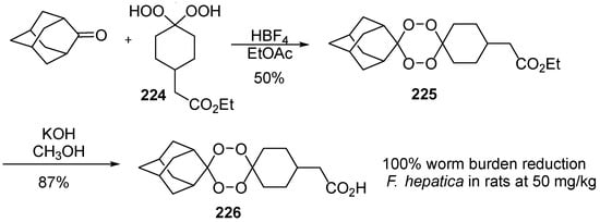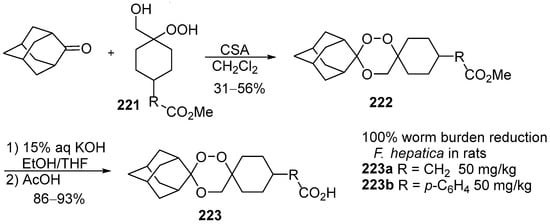 Various tetrasubstituted 1,2,4-trioxolanes (ozonides) have become the breakthrough in the field of biologically active synthetic peroxides. Nowadays ozonides are considered as the most promising candidates in the treatment of helminth diseases (Scheme 16). The 100% worm burden reductions were observed with a single oral dose of 1000 mg/kg OZ78 (98) in Echinostoma caproni-infected mice. A single dose of 100 mg/kg OZ78 (98) resulted in 100% worm burden reductions against juvenile and adult Fasciola hepatica-mouse model [77]. Single oral doses of 100 mg/kg OZ78 (98) is efficient against adult triclabendazole-resistant F. hepatica-infected rats [78]. Later, the efficacy of 1,2,4-trioxolane OZ78 (98) against an experimental infection with Fasciola hepatica in sheep was confirmed [79,80]. It was found that the spiroadamantane fragment and the carboxyl group in the OZ78 (98) are necessary for activity against F. hepatica [81].