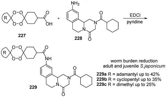 Synthetic 1,2-dioxolanes 88 showed high in vitro activity against helminths Schistosoma mansoni (Scheme 13) [72].