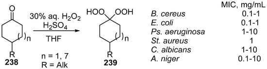 The modern trend in medicinal chemistry of peroxides is the search of effective anticancer drugs. The natural and synthetic peroxides exhibiting a cytotoxic effect on cancer cells already include hundreds of compounds [31,32,33,34]. Peroxides possessing antimalarial and cytotoxic activity are the subject of numerous studies [35,36,37,38,39,40,41,42], and are not considered in this review.
