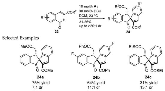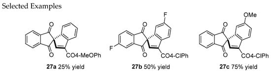 - Sánchez-Larios, E.; Holmes, J.M.; Daschner, C.L.; Gravel, M. Synthesis of spiro bis-indanes via domino Stetter-aldol-Michael and Stetter-aldol-aldol reactions: Scope and limitations. Synthesis 2011, 2011, 1896–1904. [Google Scholar] [CrossRef]