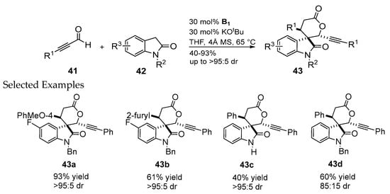 - Du, D.; Hu, Z.; Jin, J.; Lu, Y.; Tang, W.; Wang, B.; Lu, T. N-heterocyclic carbene-catalyzed three-component domino reaction of alkynyl aldehydes with oxindoles. Org. Lett. 2012, 14, 1274–1277. [Google Scholar] [CrossRef] [PubMed]