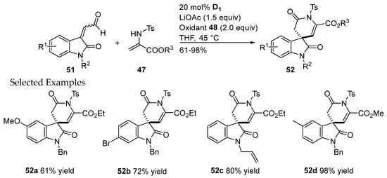 - Zhang, W.G.; Xu, J.Y.; Cao, J.; Fang, C.; Zhu, J.D.; Lu, T.; Du, D. N-heterocyclic carbene-mediated formal [3+3] annulation of isatin-derived α,β-unsaturated acids: Access to functionalized 3,4′-spirooxindole d-lactones. Tetrahedron 2017, 73, 3249–3254. [Google Scholar] [CrossRef]
