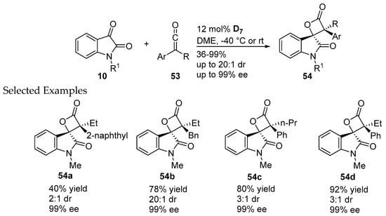 - Wang, X.N.; Zhang, Y.Y.; Ye, S. Enantioselective synthesis of spirocyclic oxindole-β-lactones via N-heterocyclic carbene-catalyzed cycloaddition of ketenes and isatins. Adv. Synth. Catal. 2010, 352, 1892–1895. [Google Scholar] [CrossRef]