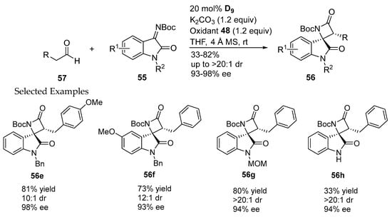 - Xu, J.; Yuan, S.; Peng, J.; Miao, M.; Chen, Z.; Ren, H. Enantioselective [2+2] annulation of simple aldehydes with isatin-derived ketimines via oxidative N-heterocyclic carbene catalysis. Chem. Commun. 2017, 53, 3430–3433. [Google Scholar] [CrossRef] [PubMed]
