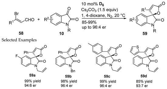 - Mukherjee, S.; Joseph, S.; Bhunia, A.; Gonnade, R.G.; Yetra, S.R.; Biju, A.T. Enantioselective synthesis of spiro γ-butyrolactones by N-heterocyclic carbene (NHC)-catalyzed formal [3+2] annulation of enals with 3-hydroxy oxindoles. Org. Biomol. Chem. 2017, 15, 2013–2019. [Google Scholar] [CrossRef] [PubMed]