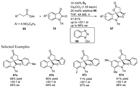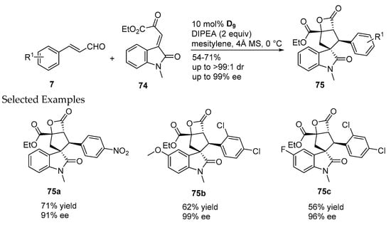 - Chen, X.Y.; Chen, K.Q.; Sun, D.Q.; Ye, S. N-heterocyclic carbene-catalyzed oxidative [3+2] annulation of dioxindoles and enals: Cross coupling of homoenolate and enolate. Chem. Sci. 2017, 8, 1936–1941. [Google Scholar] [CrossRef] [PubMed]