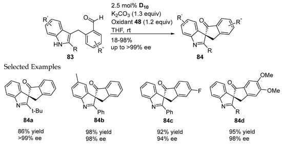 - Bera, S.; Daniliuc, C.G.; Studer, A. Oxidative N-heterocyclic carbene catalyzed dearomatization of indoles to spirocyclic indolenines with a quaternary carbon stereocenter. Angew. Chem. Int. Ed. Engl. 2017, 56, 7402–7406. [Google Scholar] [CrossRef] [PubMed]