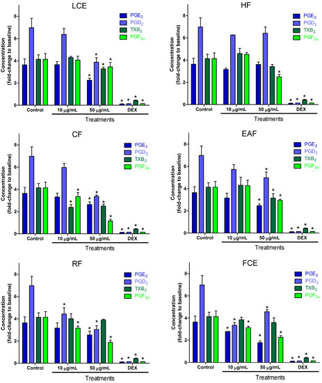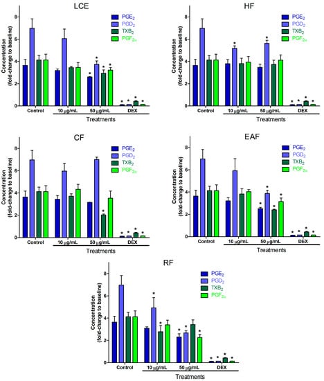 Inflammatory mediator release in LPS-induced RAW 264.7 cells resulted in an increase of 3.63 ± 0.53 for PGE2, 6.97 ± 0.84 for PGD2, 4.13 ± 0.39 for TXB2, and 4.13 ± 0.51 for PGF2α. All results are given as the fold-change in relation to basal unstimulated cells (i.e., the level of cell mediator release with no stimulus). On the other hand, dexamethasone showed lower values compared to the LPS-induced group, resulting in 0.12 ± 0.02 for PGE2, 0.14 ± 0.002 for PGD2, 0.42 ± 0.05 for TXB2, and 0.15 ± 0.01 for PGF2α, expressed as the fold-change in relation to baseline values. LPS [43,44] and dexamethasone [45] are well established as controls for the RAW 264.7 cell model of inflammation.