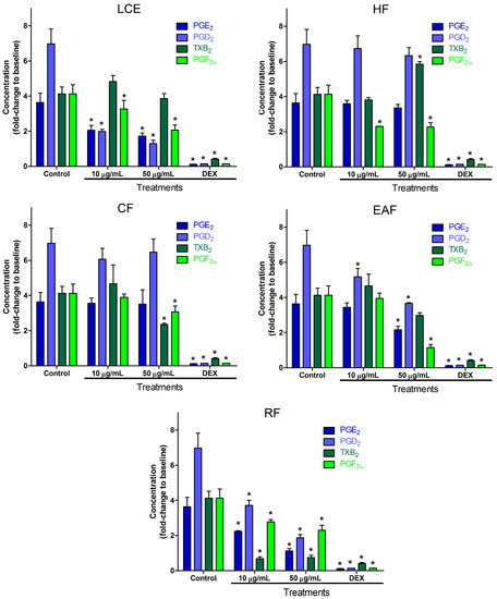 Effect of leaf crude extract (LCE), hexane fraction (HF), chloroform fraction (CF), ethyl acetate fraction (EAF), residual fraction (RF), and flower crude extract (FCE) of M. sylvestris on PGE2, PGD2, TXB2, and PGF2α production in LPS-stimulated RAW 264.7 cells. Cells were treated with LPS in the absence or presence of the fractions at two concentrations (10 and 50 µg/mL). Dexamethasone (DEX) was used as positive control. After incubation, cell culture supernatants were harvested, and PGE2, PGD2, TXB2, and PGF2α production was determined. Values are expressed as mean ± SD. * p < 0.001 vs. control (LPS alone).