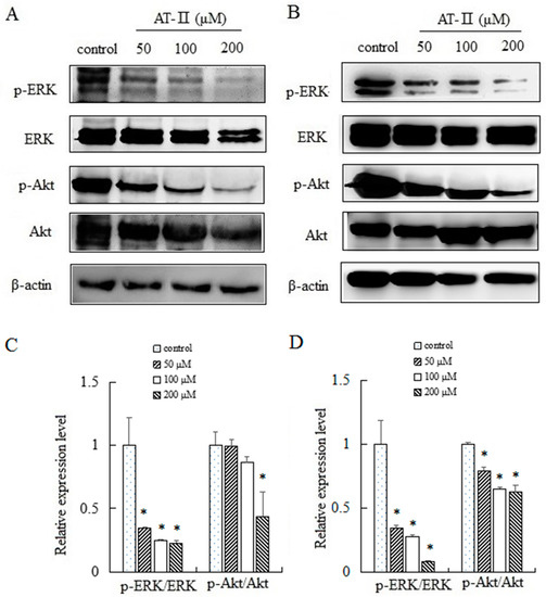 2.6. AT-II Inhibits the Phosphorylation of ERK and Akt in HGC-27 and AGS Cells