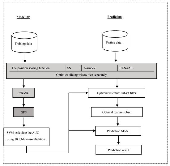 Feature selection is an important step for building an effective prediction model [29,30,31,32,33]. Generally, not all features have an equivalent contribution to the glycation prediction system. In addition, some features are usually noisy and redundant. To analyse the features, we used the mRMR method [34] to rank all the features. Then, we implemented a new GFS procedure based on the mRMR rank list. The GFS procedure is as follows: Features in the mRMR feature rank list were added one by one to make the feature subset, and if the AUC of the feature subset fulfils the criteria of improvement by means of an SVM in 10-fold cross-validation, and this feature is added. Finally, the feature subset that has the highest AUC was used to train the model for predicting glycation sites.