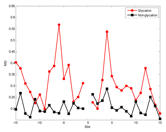The position conservation of residues surrounding the lysine can usually provide much helpful information to predict glycation sites. The analysis was performed for the distribution of the M(l) value of each position around lysine residues, as shown in Figure 2.