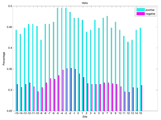 In order to analyse the difference of secondary structure (SS) between glycated and non-glycated peptides, the distribution of SS around lysine residues is calculated, as illustrated in Figure 4, Figure 5 and Figure 6, which demonstrates that the residues around the glycation site favoured to form helix structures. Moreover, it was observed that the closer the site gets to the glycation sites, the lower the frequency of helix and sheet structures, and the greater the frequency of coil structures, whereas the value of coils and sheets surrounding non-glycation sites were higher than that around the glycation sites. Moreover, the frequency of helix and sheet structures has a similar fluctuation in positive and negative samples. We can conclude from the above that the difference of SS could discriminate glycation and non-glycation sites efficiently.