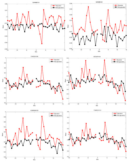 We knew that The Amino Acid Index database (AAindex) played very important roles in PTM prediction [16]. In this study, we selected the top 20 amino acid indices (shown in Table 1) corresponded to the best AUC value. Afterwards, the distribution of five of the 20 amino acid indices of residues around the glycation and non-glycation sites was statistically analysed. The six representative amino acid indices were shown in Figure 7. More details for the distribution of 20 amino acid indices are shown in the Supplementary Information. The results show that, for the 20 amino acid indices, the positive samples have a larger fluctuation than the negative samples. It also illustrated that information about the 20 amino acid indices around glycation and non-glycation sites was very different.