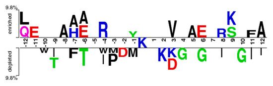 From Figure 2, it can be observed that the M(l) value of almost each position in positive samples is greater than that in negative samples. It makes clear that these glycation sites prefer some special residues. Especially, it was found that the M(l) value at −6 and +4 sites were significantly higher than other sites, indicating that these two sites play relatively more important roles for glycation. Further analysis shows that the frequency of alanine (A), glutamic acid (E) and leucine (L) is >10% at −6 and +4 sites of glycation. From the sequence logo of the experimental 210 glycation peptides (Figure 3), we also found that alanine (A), glutamic acid (E), leucine (L), and lysine (K) have preferences to appear near the glycation sites. The results also support that acidic amino acids, mainly glutamate (E), and lysine (K) residues, catalyse the glycation of nearby lysines [11,14,15]. All in all, these analyses suggested that position conservation influenced the glycation.