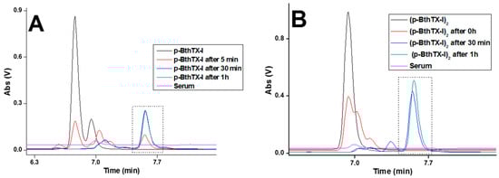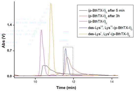 To determine the stabilities of the peptides, high-performance liquid chromatography (HPLC) analyses using a C18 reverse phase column were performed. The peptide p-BthTX-I and its disulfide linked dimer (p-BthTX-I)2 exhibited retention times (RT) of 6.7 and 6.9 min, respectively (Figure 1). After incubation with human serum, both peptides showed accelerated rates of initial degradation (t = 5 min), which were clearly demonstrated by the decreased integrated peak areas (Figure 1, red line). These data also indicated that complete degradation of the dimer occurred after 30 min (Figure 1, blue line). Post degradation (30 min and 1 h, respectively), both peptides exhibited peaks that eluted at 7.5 min (Figure 1, marked box), suggesting the same degradation product for both the monomeric and dimeric forms of the peptide. Additionally, we have shown in a previous work that dimerization is swiftly initiated when the monomeric p-BthTX-I peptide is incubated in the culture medium [19], suggesting that only the dimer (p-BthTX-I)2 likely occurs in human serum.